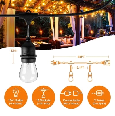 Outdoor String Lights 48Ft Plug-In Anti Glare, Beautiful Gold Tip LED Bulbs - 48 Ft
